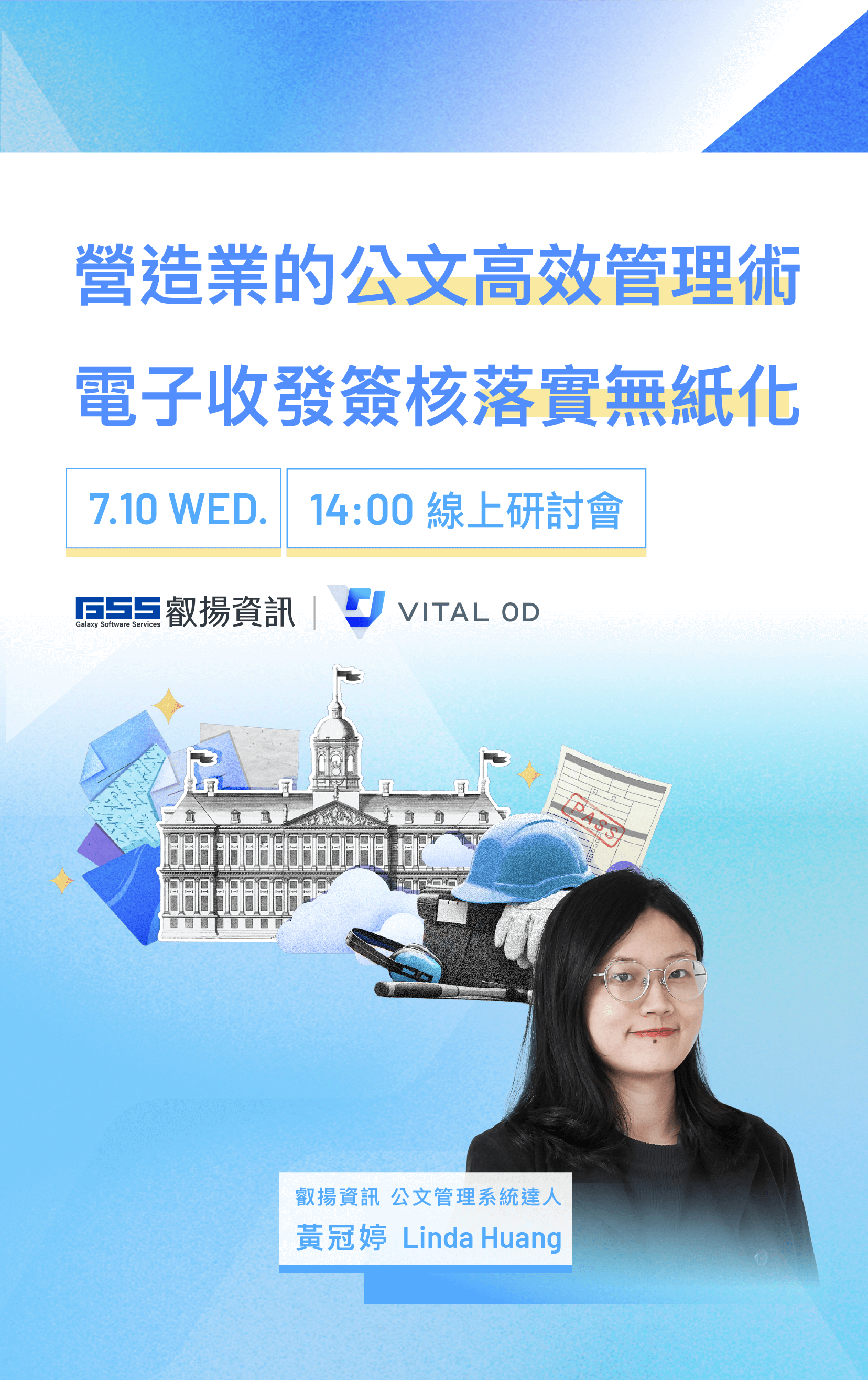 活動日期| 2024 / 07 / 10 (三) 14:00 - 15:00 活動地點| 本場次活動使用 Microsoft Teams 平台 (將於 13:50 開放加入會議) 主辦單位| GSS 叡揚資訊股份有限公司 洽詢專線| (02)2586-7890 #10785 許小姐 或 Email: vitalcrm@gss.com.tw |