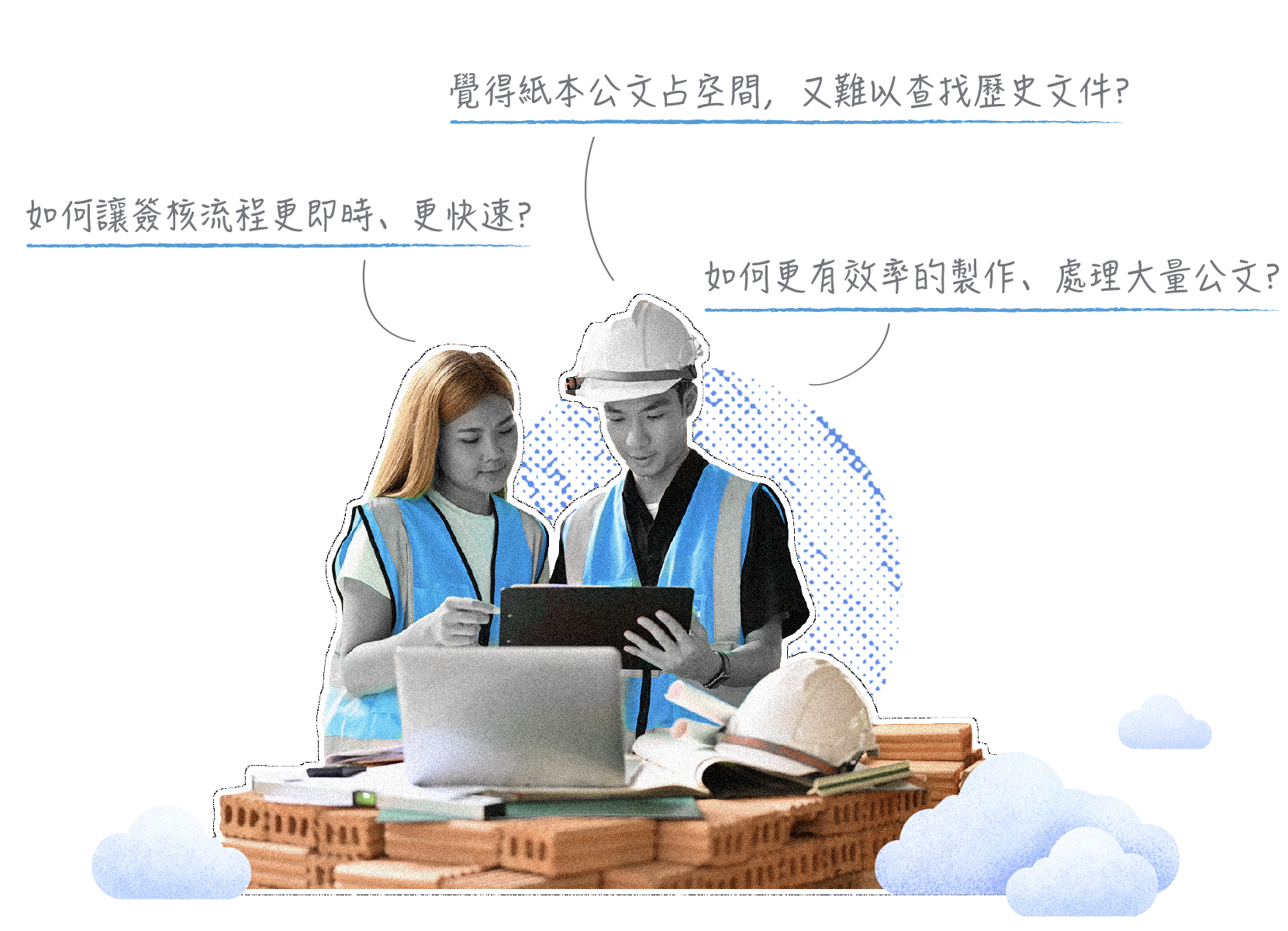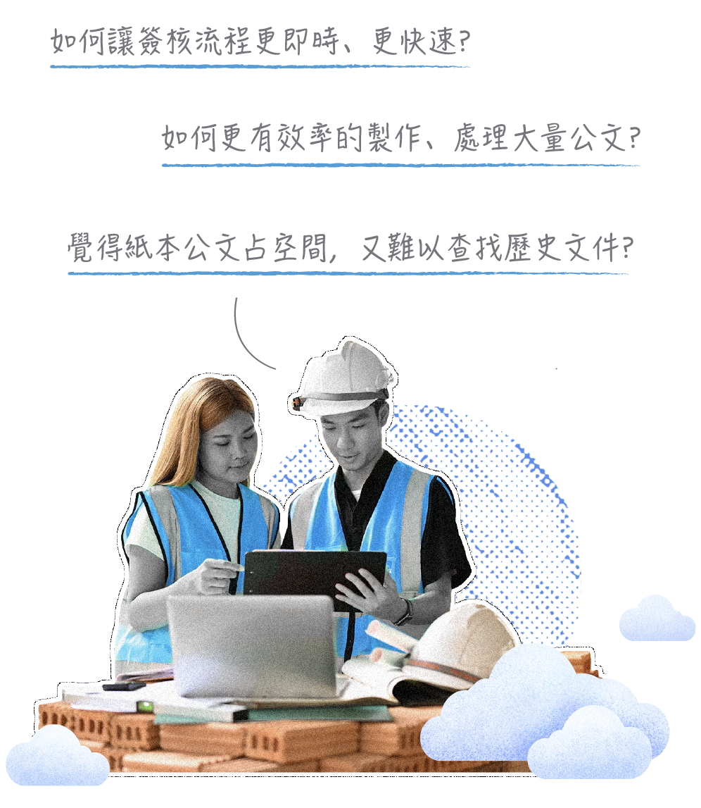 營造業與政府往來公文頻繁,總是在公文登打與校對修改花費大量時間,傳統使用紙本公文往往因為多級簽核關卡延誤,導致派送流程漫長,而使工程案子進度也受到影響,每個案子大量的紙本文件分類歸檔不易且十分佔空間、有遺失風險,若臨時想查閱歷史文件也需耗時查找