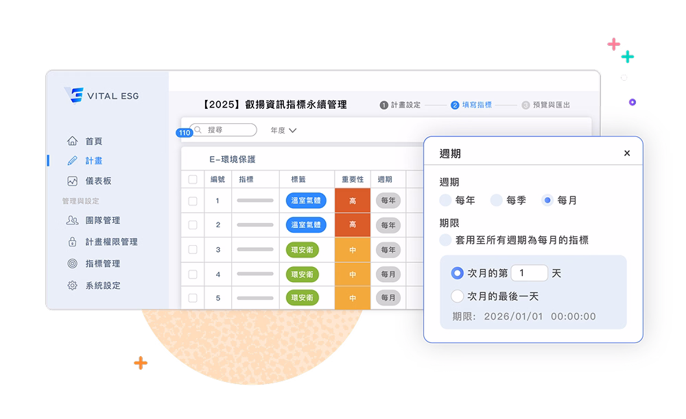 - 指標責任指派與填報頻率設定 (按月/季/年)