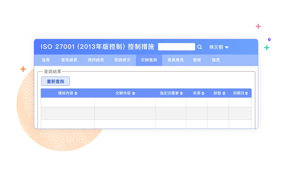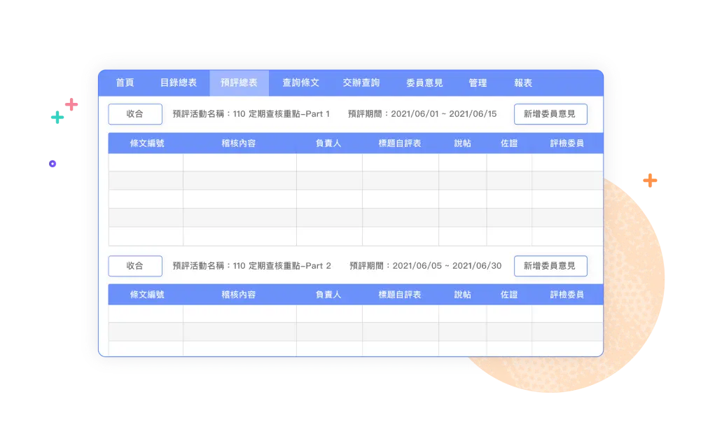 - 線上進行內稽自評、填寫成績,以報表查詢所有條文內稽成果