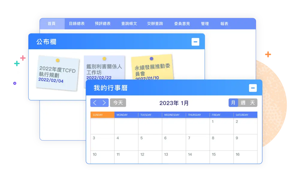 提供多維度視覺化進度報表,無論具體措施進度、交辦事項統計、佐證明細、預評意見皆一目瞭然。
