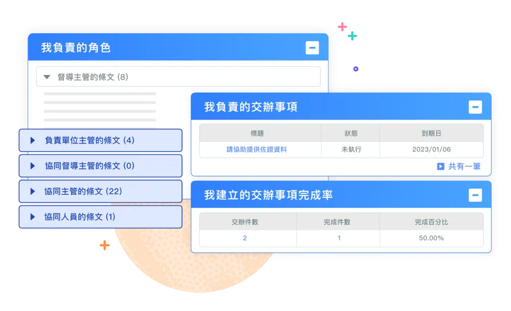 - 逐條呈現查核條文,一目了然,指派條文負責人與督導人員協同分工