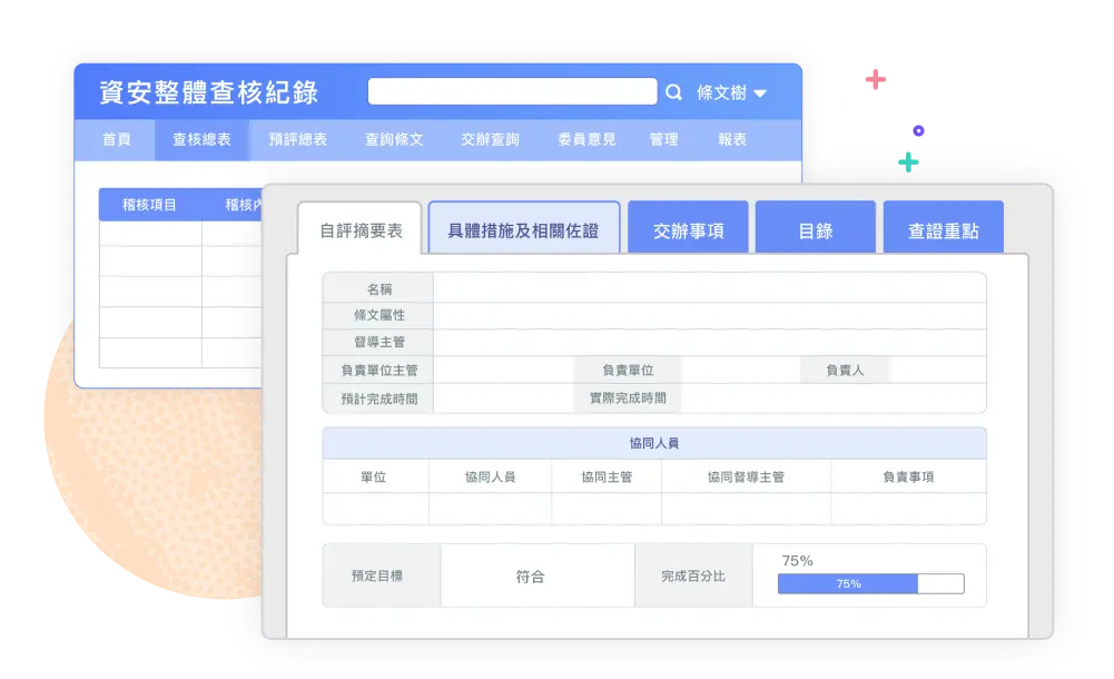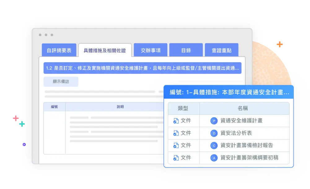 - 以目錄總表功能,線上清楚展示所有驗證條文的具體措施、佐證文件、與自評紀錄